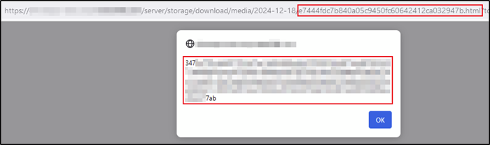 Nun kann der Angreifer einem beliebigen anderen Nutzer einen Download-Link für diese schädliche HTML-Datei senden, in diesem Fall: https://{host}/server/storage/download/media/{date}/{fileName}?token={attacker_session_token}. Wenn der angegriffene Nutzer auf den Link klickt, wird die HTML-Datei geöffnet und das schädliche JavaScript ausgeführt. So könnte ein Angreifer beispielsweise auf den Session-Token des Opfers zugreifen, wenn dieses sich vorher angemeldet hat und bei der Anmeldung die Option „Angemeldet bleiben“ ausgewählt hat: