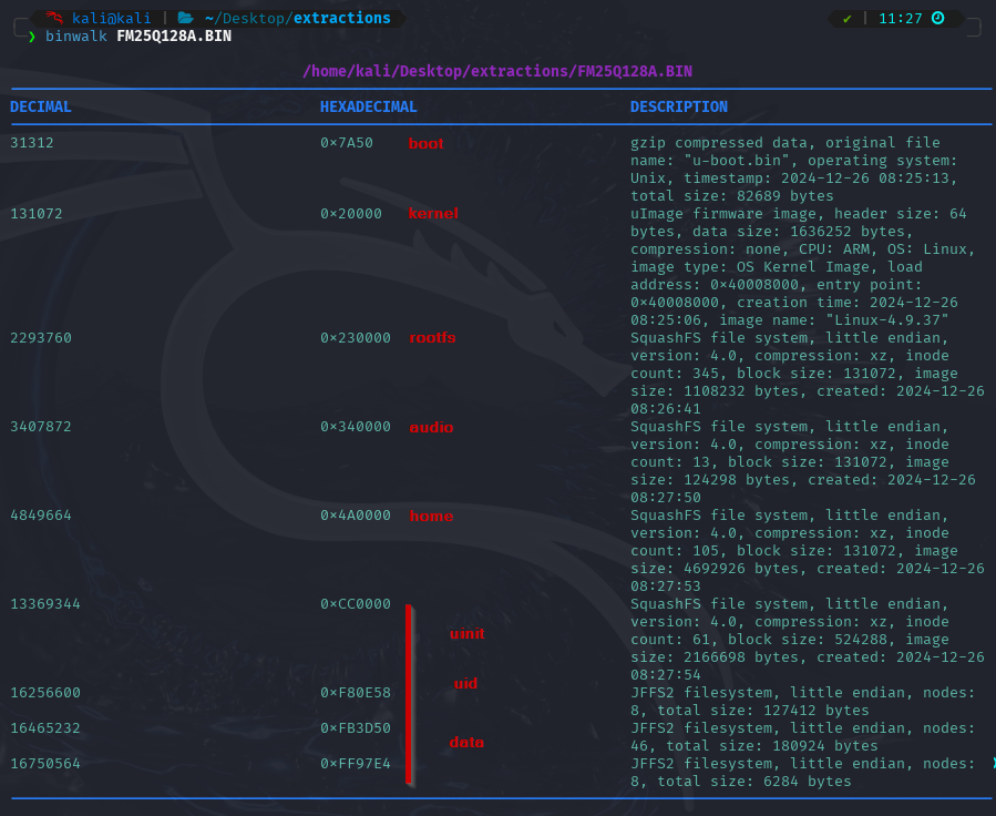 Zur Analyse des extrahierten Firmware Dumps kann nun das Tool binwalk (https://github.com/ReFirmLabs/binwalk) eingesetzt werden. Binwalk analysiert den Dump und sucht anhand von Signaturen nach Dateisystemen, Firmware Images und Dateien.